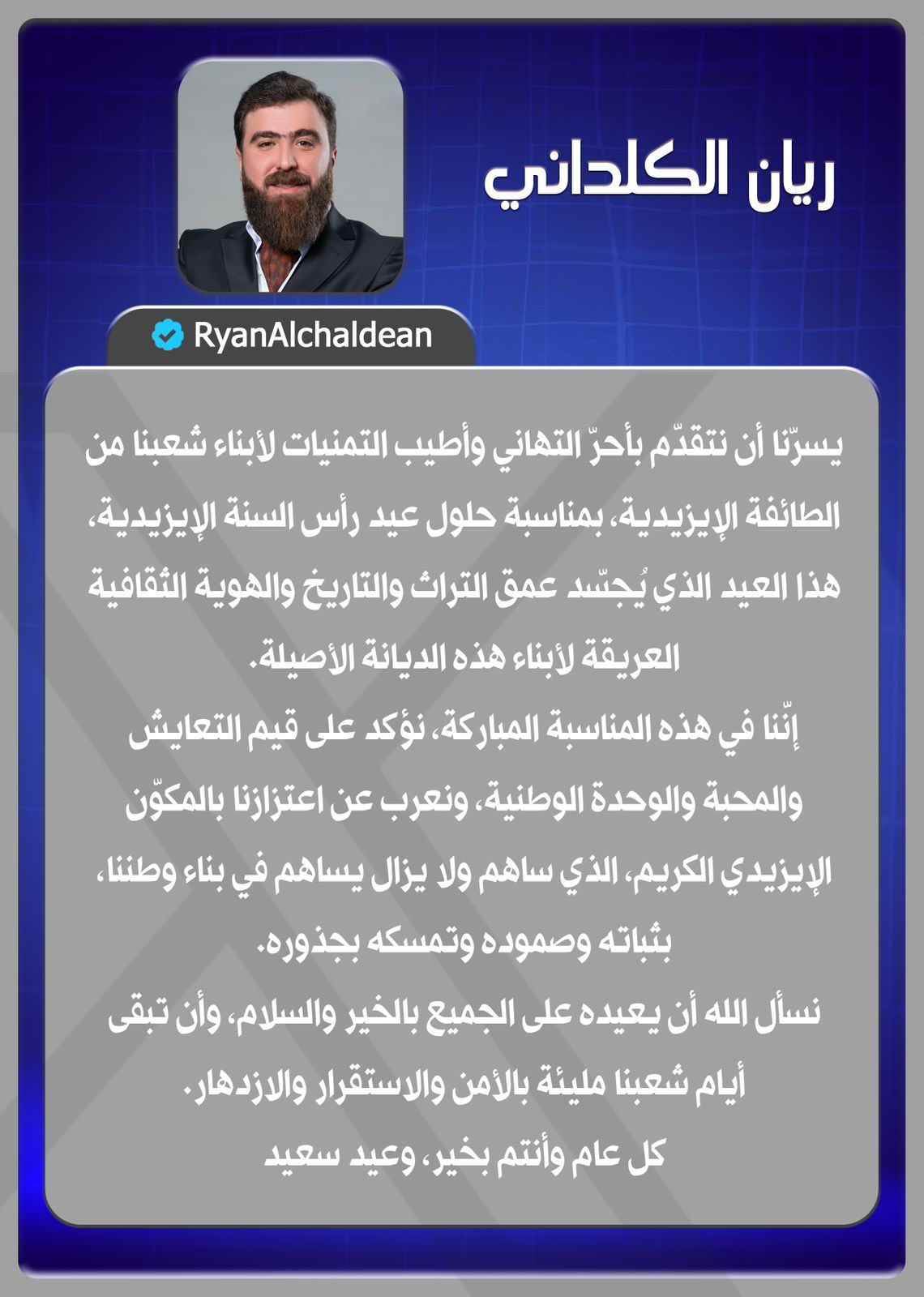 هنأ السيد ريان الكلداني، اليوم الأربعاء، بمناسبة حلول عيد رأس السنة الايزيدية، معرباََ عن اعتزازنا بالمكون الايزيدي الذي ساهم ولا يزال يساهم في بناء وطننا.