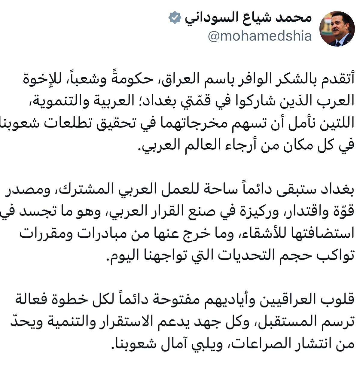 قدم رئيس مجلس الوزراء السيد محمد شياع السوداني، اليوم السبت، شكرهُ وتقديرهُ إلى الأخوة العرب الذين شاركوا في قمّتي بغداد.