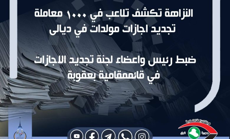 تمكَّنت ملاكات هيئة النزاهة الاتحاديَّة في مُحافظة ديالى من ضبط رئيس وأعضاء إحدى اللجان المُؤلَّفة في قائممقاميَّة قضاء بعقوبة و(١٠٠٠) معاملة؛ على خلفيَّة رصد وجود حالات تلاعبٍ وتزويرٍ.