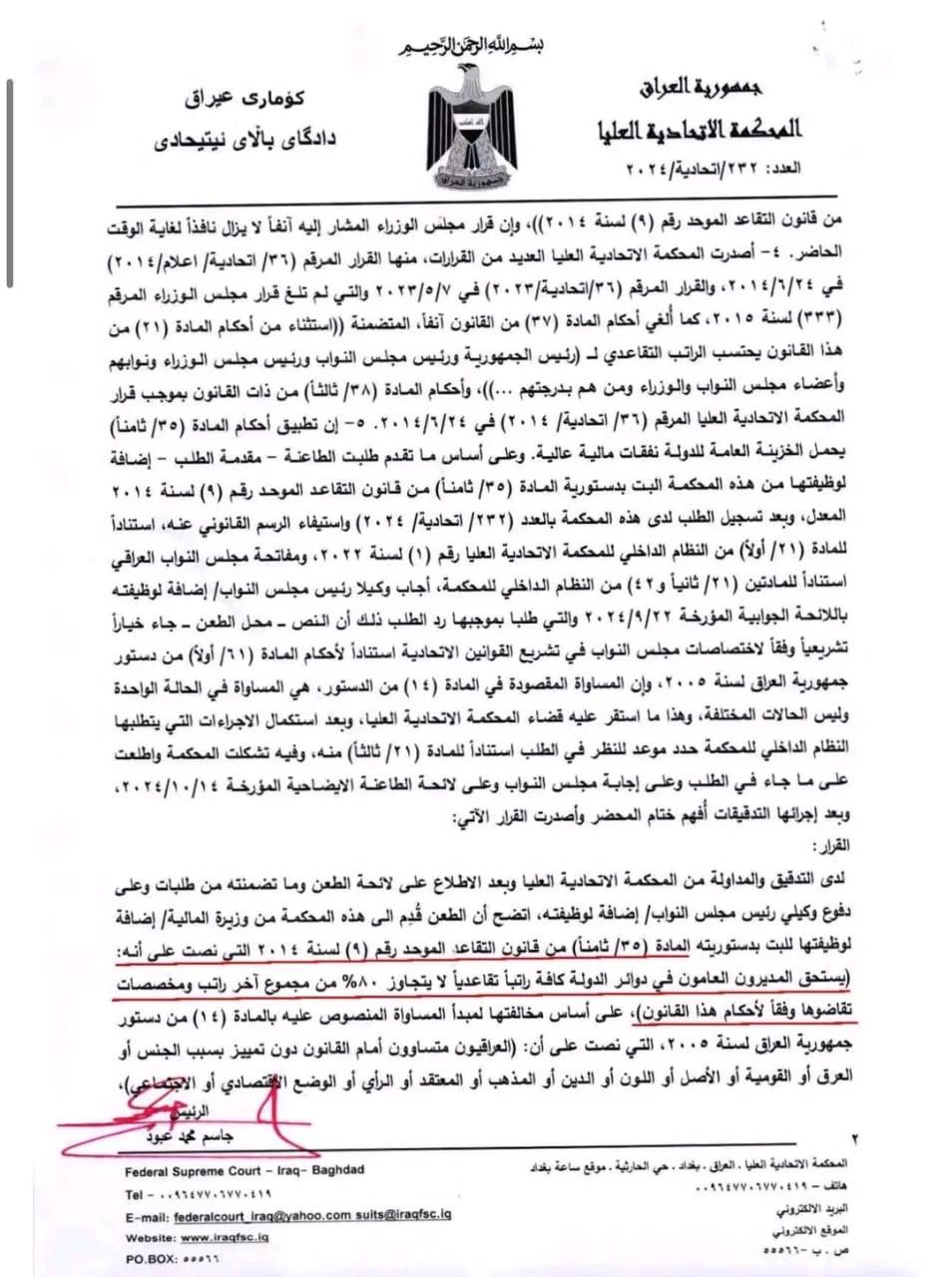 وبحسب وثائق رسمية صدرت عن المحكمة الاتحادية العليا في العراق، فإن المحكمة قررت بعدم دستورية البند (ثامناً) من المادة (35) من قانون التقاعد الموحد رقم (9) لسنة 2014، والذي كان ينص على استحقاق المديرين العامين في دوائر الدولة راتباً تقاعدياً لا يتجاوز 80% من مجموع آخر راتب ومخصصات تقاضوها، مبينة أن القرار جاء استناداً إلى مخالفة هذا النص لمبدأ المساواة المنصوص عليه في المادة (14) من دستور العراق لسنة 2005.