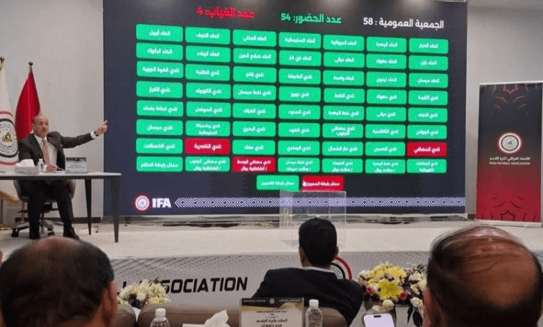 نجح الاتحاد العراقي لكرة القدم، يوم الأربعاء، بعد اجتماع للجمعية العمومية بنصاب كامل بحضور 54 عضواً من أصل 57 عضواً، بعد تأجيلين سابقين لعدم اكتمال النصاب القانوني لأعضاء الهيئة العامة.