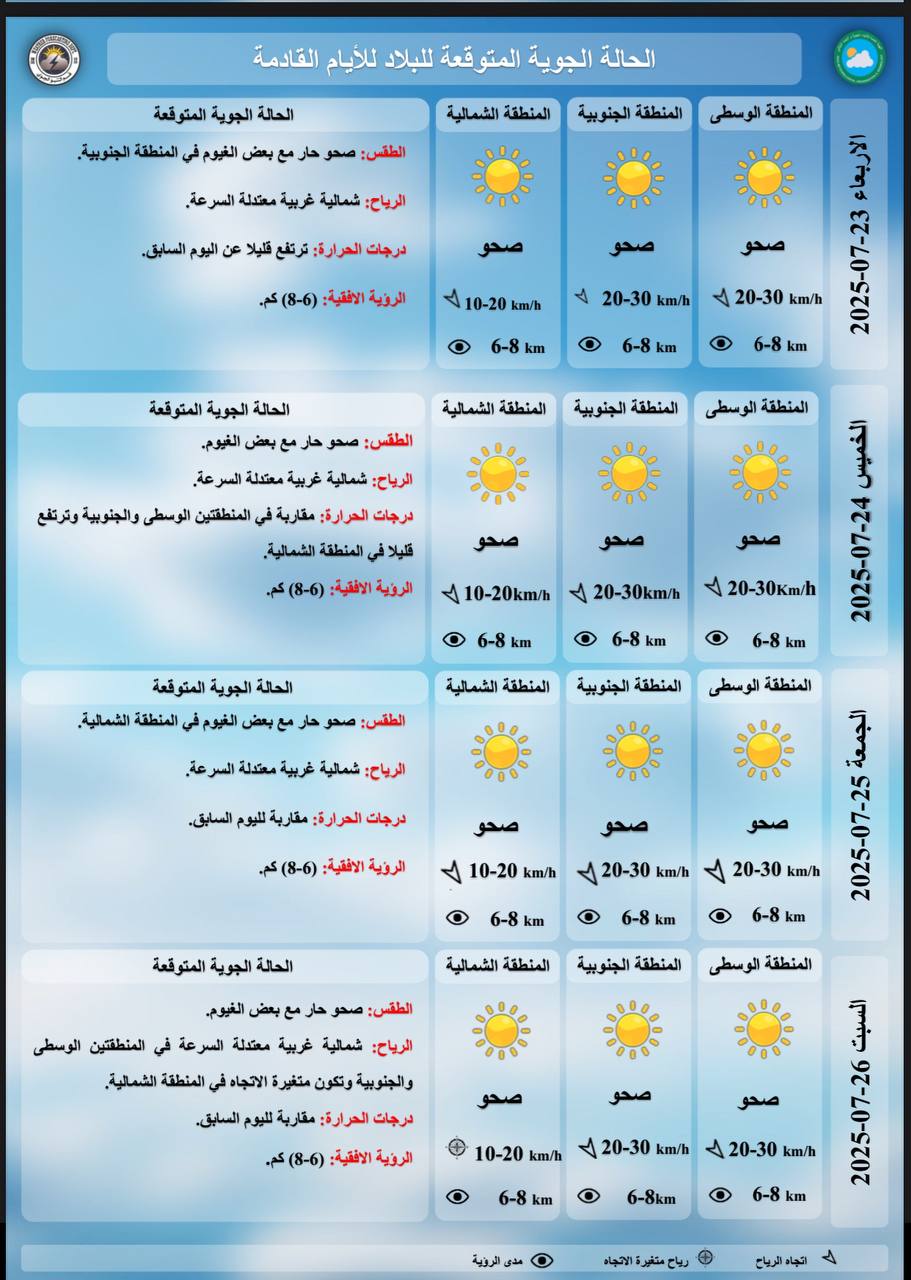 وتابع أن “الحالة الجوية المتوقعة للبلاد ليوم السبت المقبل، سيكون الطقس صحواً حاراً مع بعض الغيوم ، ودرجات الحرارة ستكون مقاربة لليوم السابق في جميع مناطق البلاد”.