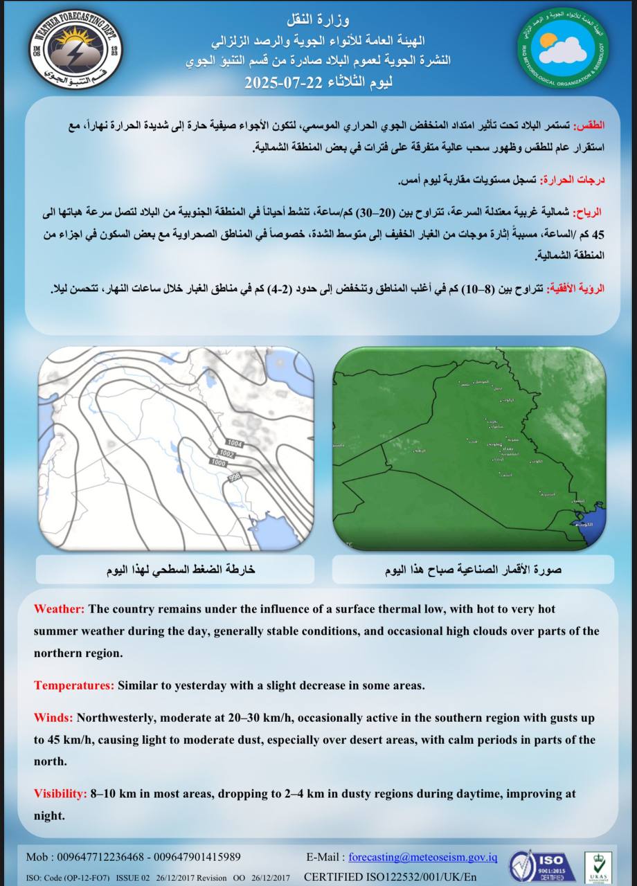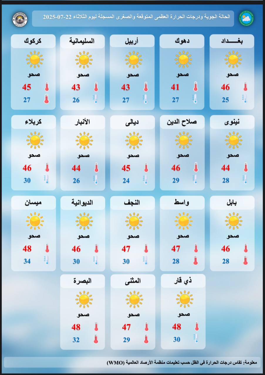 وذكر بيان للهيئة، أن “الطقس ليوم غد الاربعاء سيكون صحواً مع بعض الغيوم في المنطقة الجنوبية، ودرجات الحرارة ترتفع قليلاً عن اليوم السابق في عموم البلاد”، مبيناً أن”درجات الحرارة العظمى ستكون في بغداد وديالى وبابل وصلاح الدين والديوانية 47 ، وواسط وكربلاء المقدسة والنجف الاشرف والمثنى 48، ودهوك 43، سليمانية واربيل44، نينوى وكركوك 46 ، والانبار45، والناصرية 49 ، وميسان والبصرة 50″.