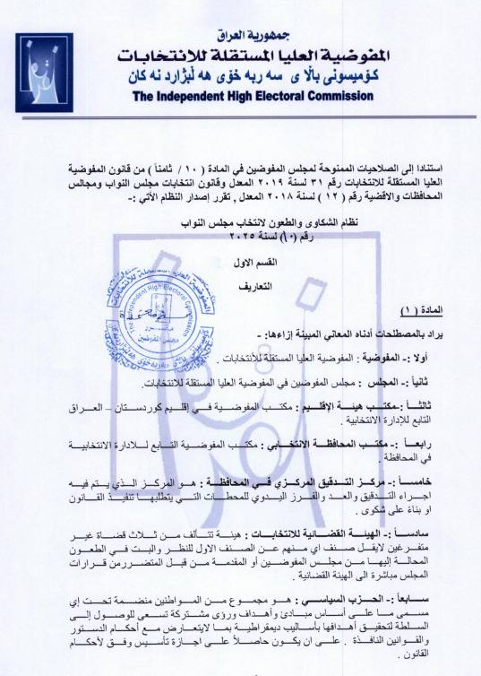 أعلنت المفوضية العليا المستقلة للانتخابات، عن نظام الشكاوى والطعون لانتخابات مجلس النواب رقم (10) لسنة 2025 .