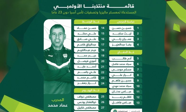 أعلن الجهاز الفني للمنتخب الأولمبي تحت 23 عامًا قائمة من 28 لاعبًا للانضمام إلى المعسكر التدريبي الذي سيقام في ماليزيا، وذلك في إطار الاستعدادات للمشاركة في تصفيات كأس آسيا للمنتخبات الأولمبية.