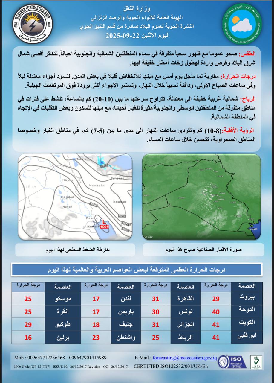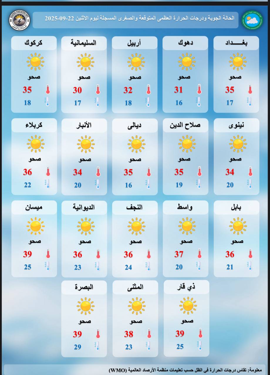 بغداد – وكالة أرض آشور: تشهد البلاد تغيرًا ملحوظًا في حالة الطقس، حيث تميل درجات الحرارة إلى الانخفاض قليلًا في عدد من المدن، مما يمهد لأجواء أكثر اعتدالًا، خاصة خلال الليل وساعات الصباح الباكر. وتظل الأجواء دافئة نسبيًا في النهار، بينما تستمر المناطق الجبلية في الشعور بالبرودة.