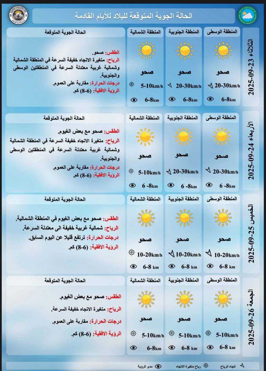 أما حركة الرياح، فتكون شمالية غربية، خفيفة إلى معتدلة. ومن المتوقع أن تنشط الرياح على فترات في المناطق الوسطى والجنوبية، مما قد يؤدي إلى إثارة بعض الغبار. في المقابل، تميل الرياح في المنطقة الشمالية إلى الهدوء مع بعض التقلبات في اتجاهها.