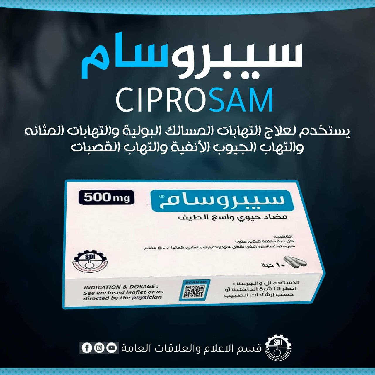 وأوضح مدير عام الشركة المهندس الكيمياوي محمد عبد القادر النعيمي، بأن مُستحضر سيبروسام يُعد من المُضادات الحيوية واسعة الطيف والمعروفة بفعاليتها العالية، حيث يُستخدم في علاج التهابات الجيوب الأنفية، والتهابات القصبات الهوائية، والتهابات المثانة والمجاري البولية، لافتاً إلى إدراج المُستحضر ضمن البرنامج الإنتاجي لشهر أيلول لتلبية احتياجات وزارة الصحة والسوق المحلية.