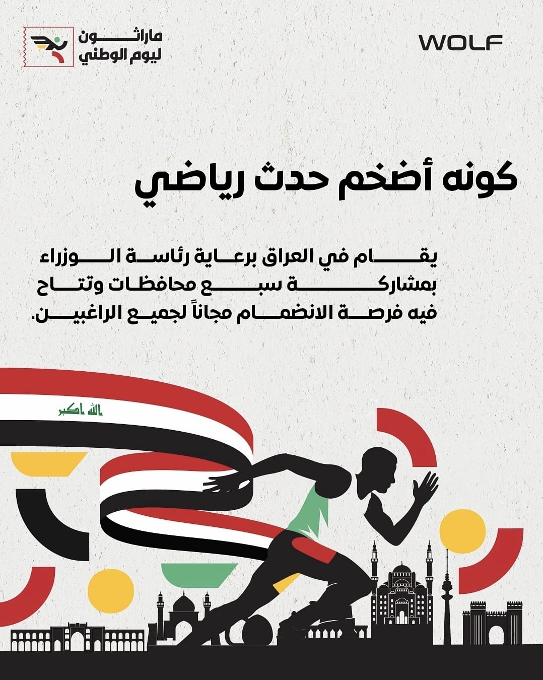 أرض آشور / رغد الحسني – تستعد العاصمة العراقية بغداد لاحتضان “أكبر ماراثون في العراق” يوم 3 تشرين الأول/أكتوبر، بالتعاون مع ماراثون “هلا بغداد”. ويأتي هذا الحدث الرياضي الضخم بالتزامن مع الاحتفالات باليوم الوطني العراقي، تحت شعار #علم_واحد_وطن_واحد، ويهدف إلى إحياء اليوم الوطني ورفع راية العراق عالياً.