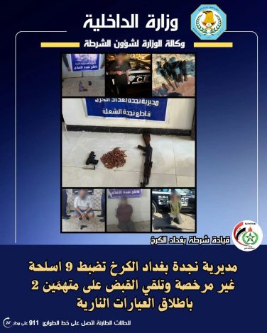 أرض آشور – في إطار جهودها المستمرة لتعزيز الأمن والاستقرار وتطبيق القانون، تمكنت مديرية نجدة بغداد الكرخ من تحقيق إنجاز أمني جديد تمثل بضبط (9) أسلحة غير مرخصة والقبض على متهمين اثنين (2) لارتكابهما جريمة إطلاق العيارات النارية.