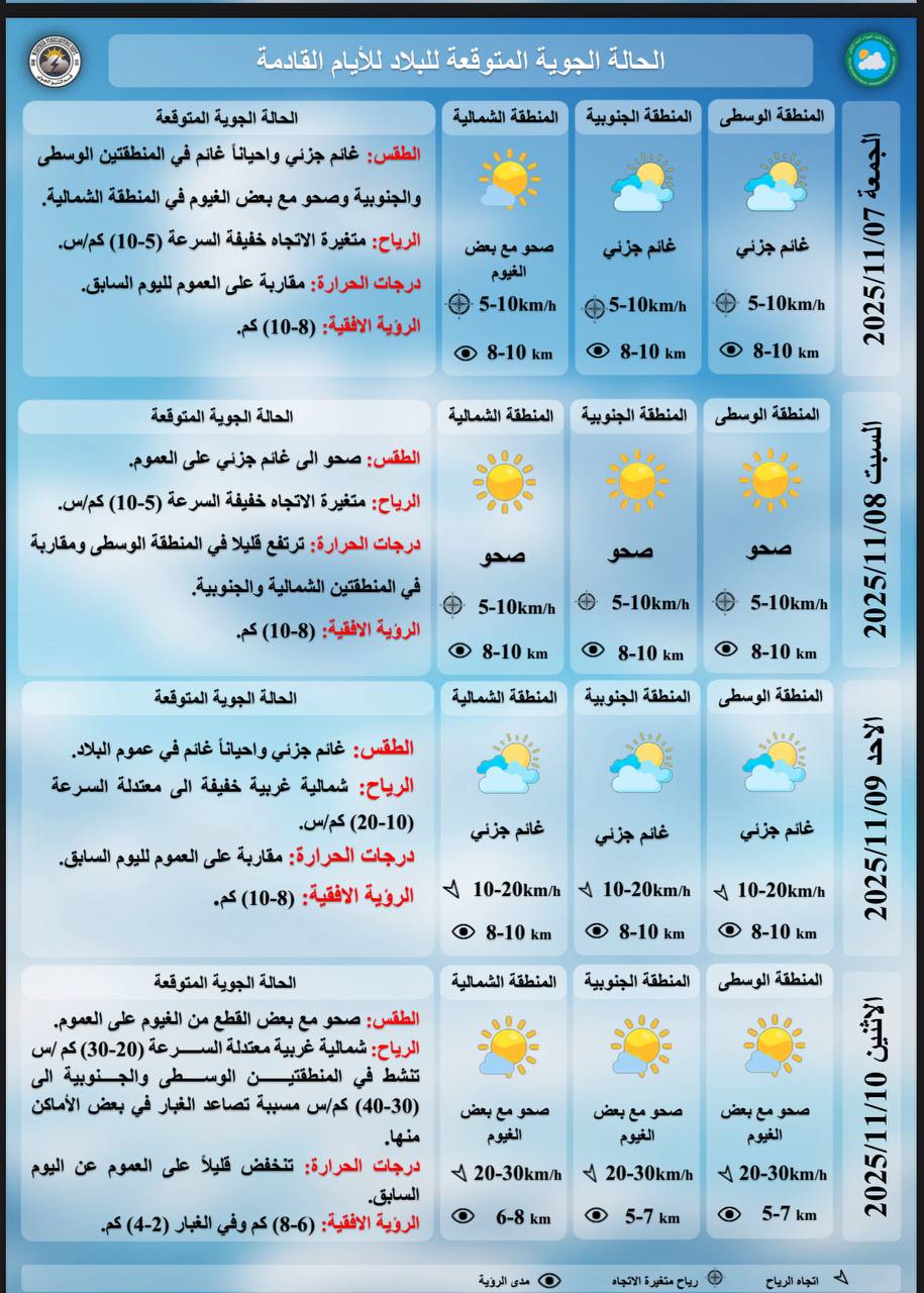 أعلنت هيئة الأنواء الجوية، اليوم الخميس، عن تفاصيل حالة الطقس في البلاد للأيام المقبلة، فيما توقعت تصاعداً للغبار وارتفاعاً جديداً في درجات الحرارة.