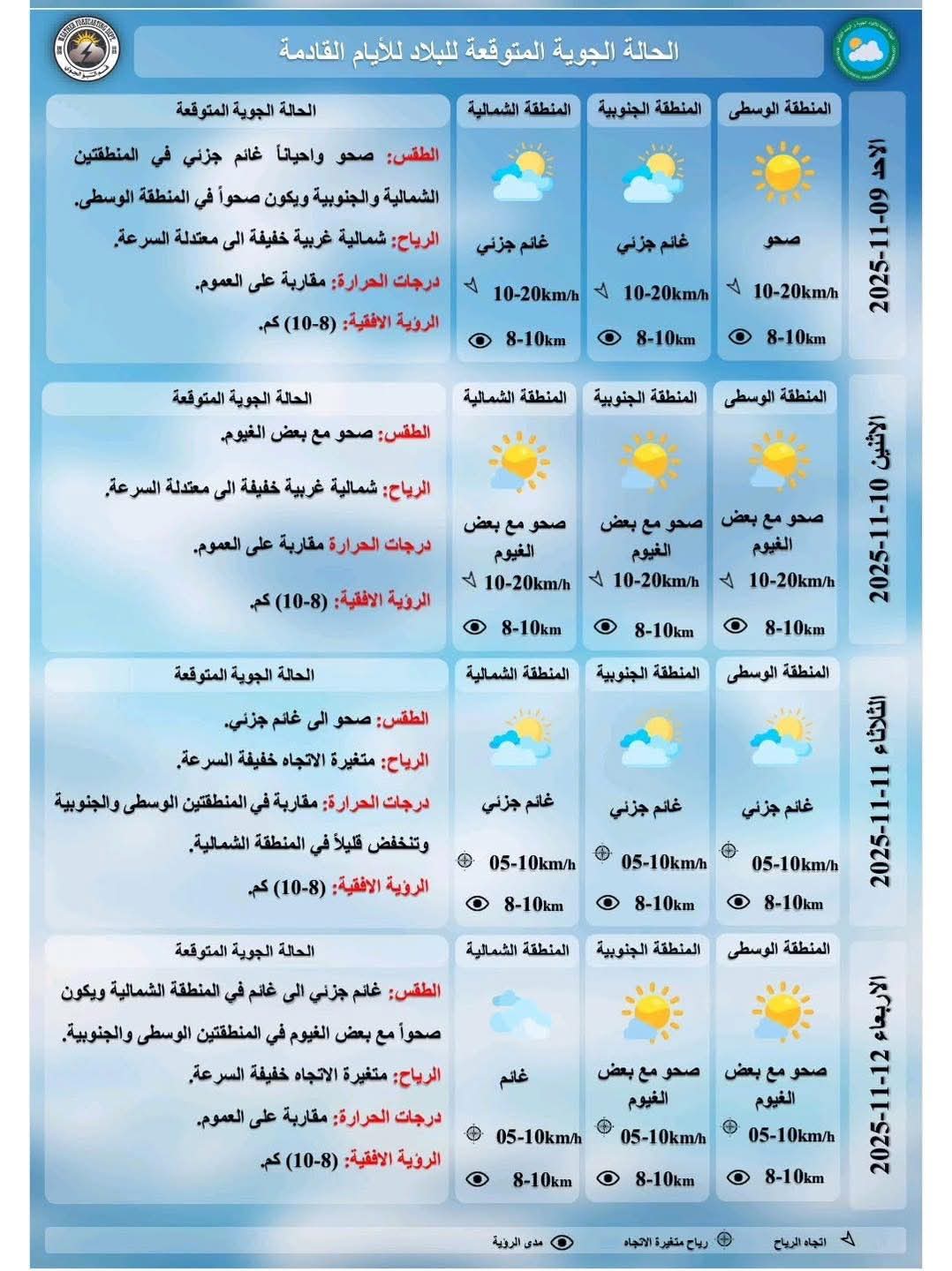 ونوه إلى، أن “طقس يوم الأربعاء القادم سيكون غائماً جزئياً إلى غائم في المنطقة الشمالية وصحواً مع بعض الغيوم في المنطقتين الوسطى والجنوبية، ودرجات الحرارة مقاربة لليوم السابق”.