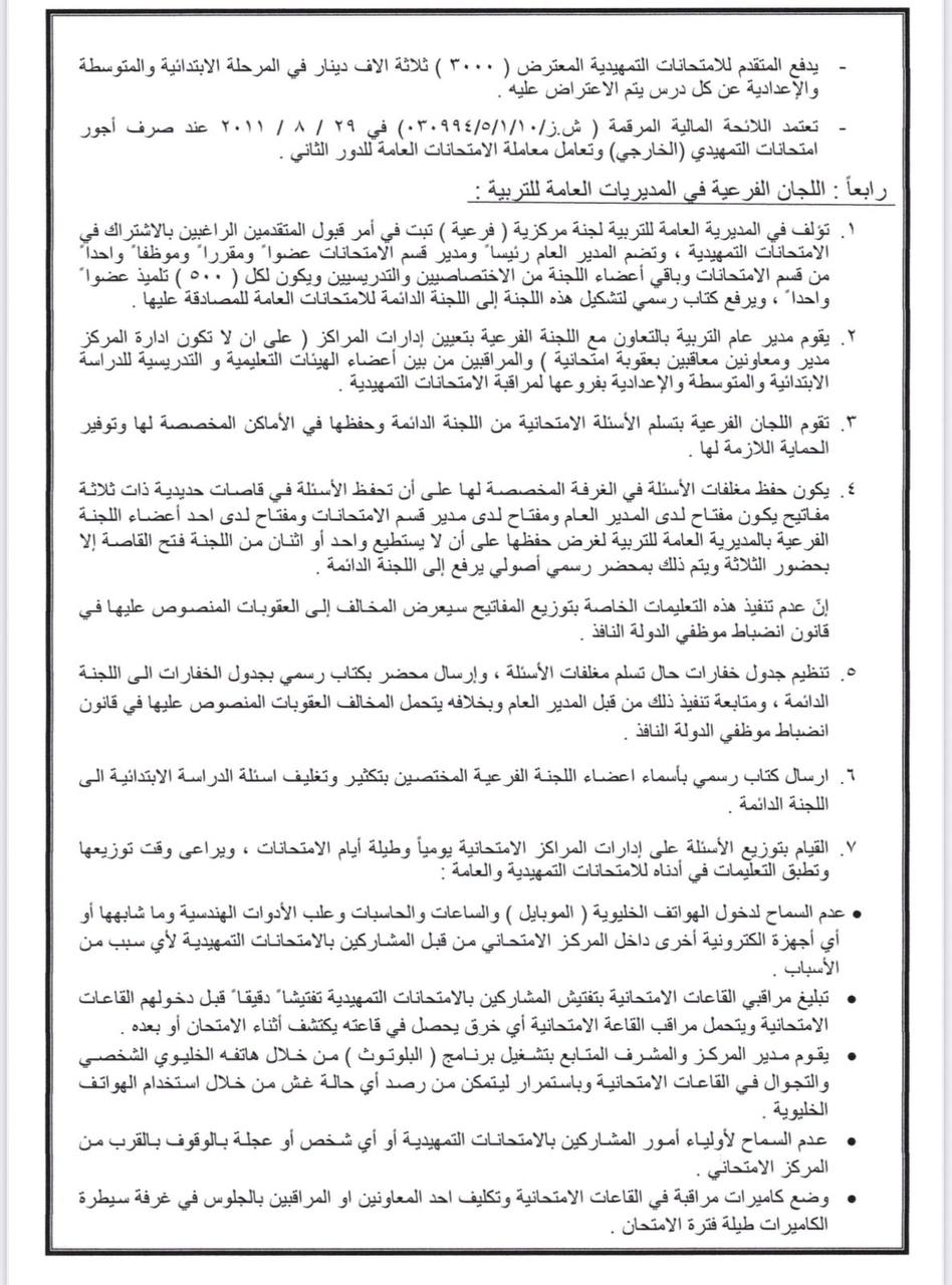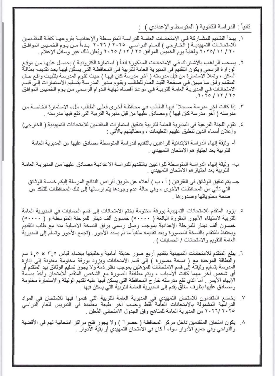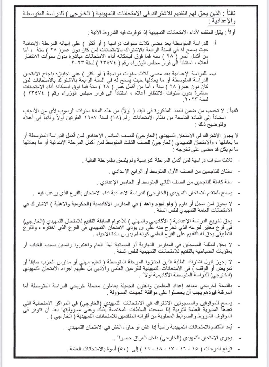 * يُسمح لمن مضى على انهائه  المرحلة الابتدائية ثلاث سنوات او اكثر التقديم لاداء الامتحانات الخارجية للدراسة المتوسطة، على ان يكون عمر المتقدم دون (28) عاما، اما من اكمل (28) فما فوق بإمكانه اداء الامتحانات مباشرة دون سنوات الانتظار اعلاه. و يقبل الراغب باداء الامتحانات التمهيدية للدراسة الإعدادية في حال انهائه المرحلة المتوسطة او ما يعادلها بنجاح.