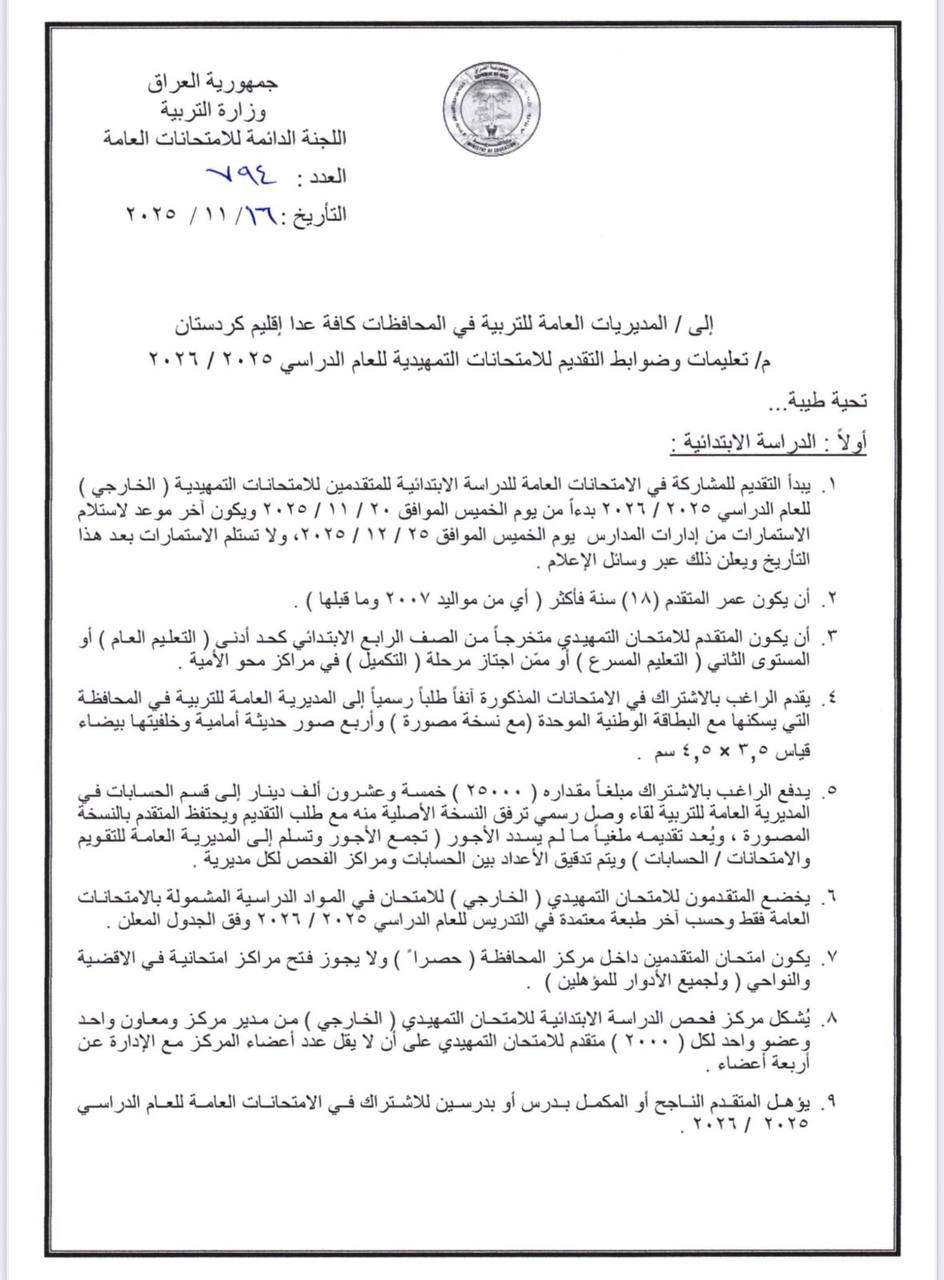 أعلن المكتب الإعلامي في وزارة التربية، اليوم الإثنين، عن موعد فتح باب التقديم امام الراغبين باداء الامتحانات التمهيدية (الخارجي) للعام الدراسي 2025 – 2026بدءا من يوم الخميس الموافق 20 / 11 / 2025 ولغاية 25/ 12 / 2025، وحسب التعليمات والضوابط الآتية: