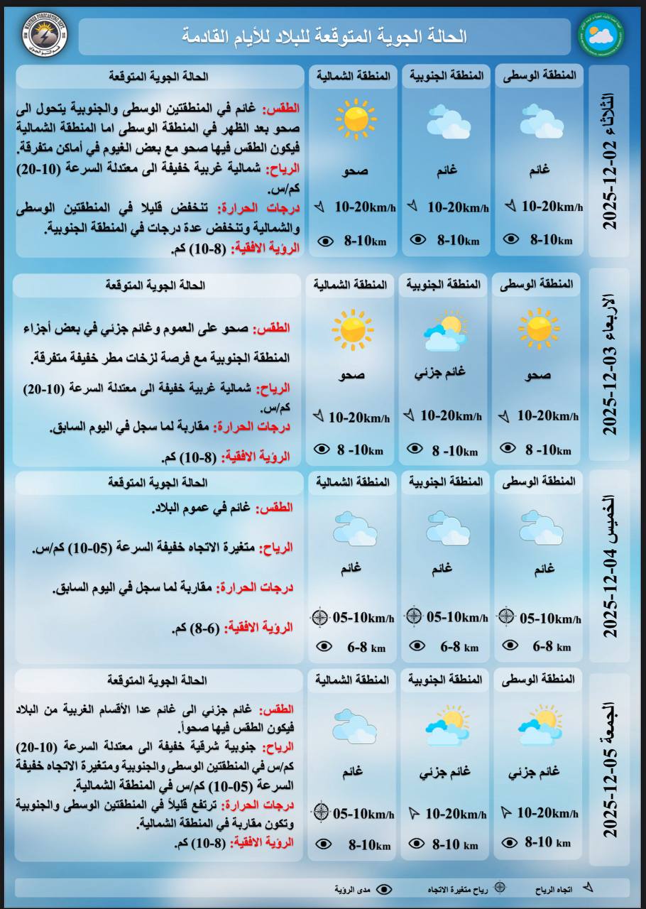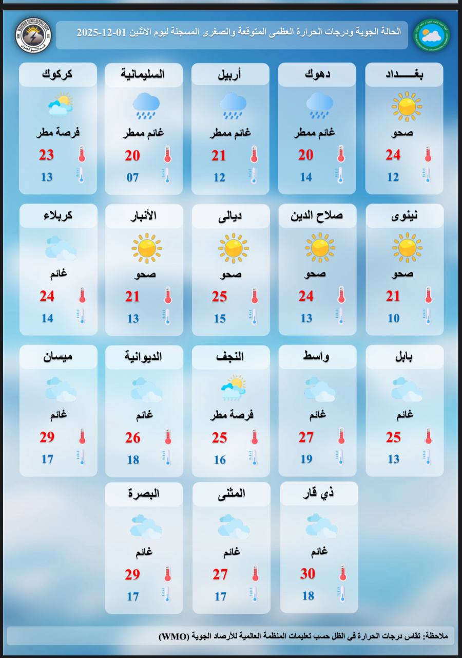 وتسجل اغلب المحافظات درجات عشرينية خلال الأيام المقبلة لتكون الأجواء معتدلة خلال النهار وباردة خلال الليل وساعات الصباح الأولى.