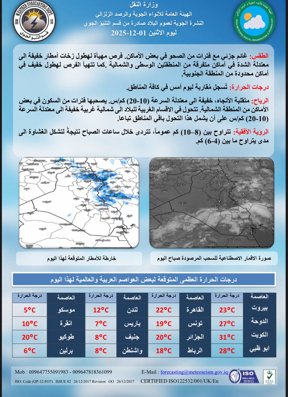 وذكر بيان لاعلام الهيئة، فرص مهيأة لهطول زخات أمطار خفيفة الى معتدلة الشدة هذا اليوم في أماكن متفرقة من المنطقتين الوسطى والشمالية، كما تتهيأ الفرص لهطول خفيف في أماكن محدودة من المنطقة الجنوبية.