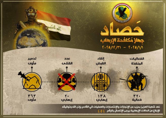 أعلن جهاز مكافحة الإرهاب، اليوم الاثنين، عن إلقاء القبض على 138 إرهابياً وقتل (20) خلال عمليات (2025) .
