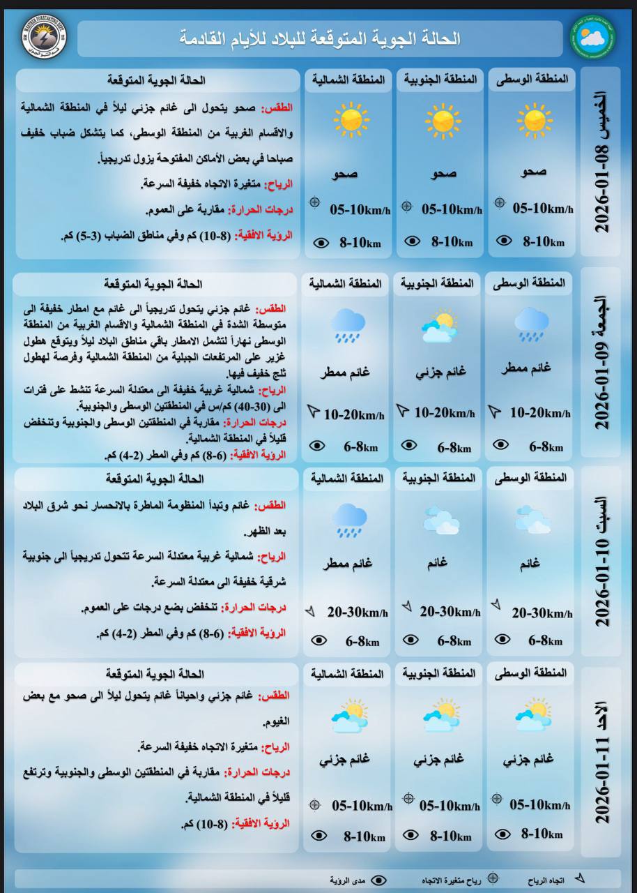 * الرؤية: تحسن تدريجي بعد زوال الضباب الصباحي.