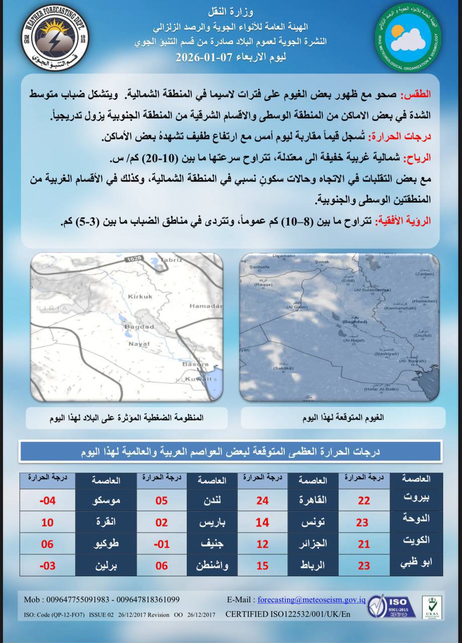 توقعت تقارير الأرصاد الجوية، اليوم الأربعاء، أن يكون طقس اليوم صحواً مع ظهور بعض السحب في المناطق الشمالية. وتشهد ساعات الصباح الأولى تشكلاً لـ ضباب خفيف إلى متوسط، يزول تدريجياً مع تقدم الوقت.