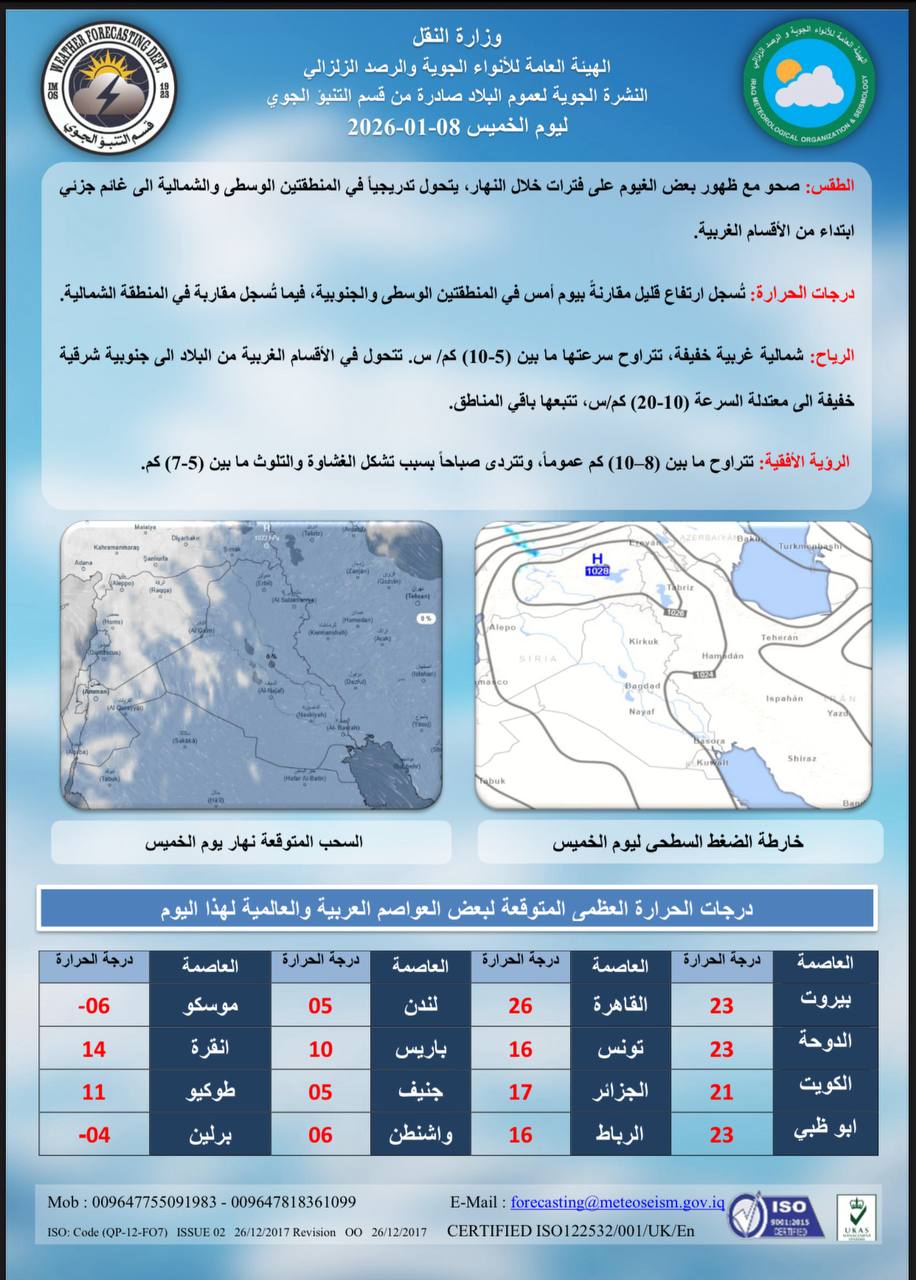 أعلنت هيئة الأنواء الجوية والرصد الزلزالي، اليوم الخميس 8 كانون الثاني 2026، عن تفاصيل حالة الطقس المتوقعة في البلاد للأيام المقبلة، مؤكدة تأثر العراق بمنخفض جوي قادم من البحر المتوسط سيؤدي إلى تساقط للأمطار والثلوج وانخفاض ملحوظ في درجات الحرارة لمدة أربعة أيام متتالية.