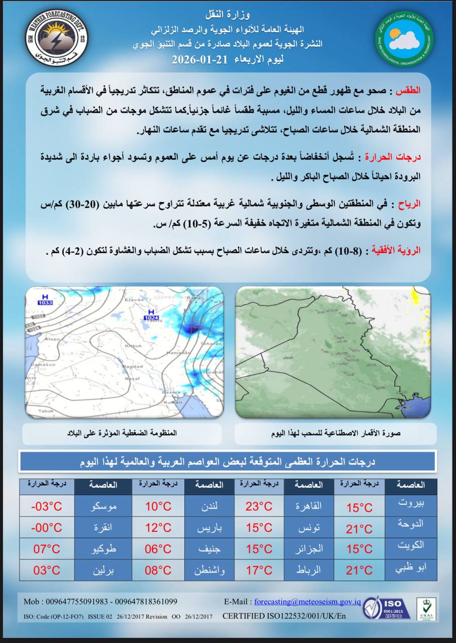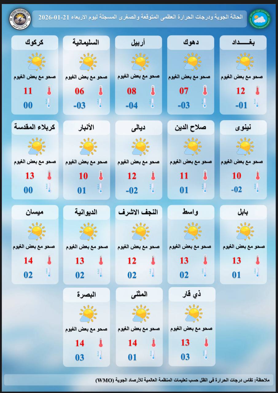 وسجلت درجات الحرارة، أنخفاضاً بعدة درجات وتسود أجواء باردة الى شديدة البرودة احياناً خلال الصباح الباكر والليل .