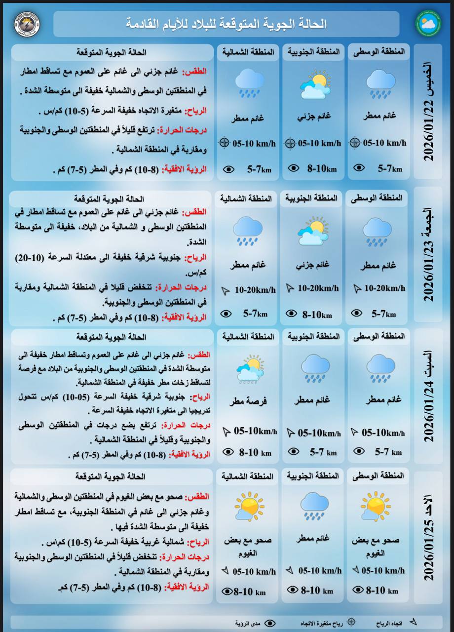تشير نماذج الطقس الى ان الأجواء خلال الأيام المقبلة غائمة في اغلب المناطق مع فرص لتساقط امطار خفيفة في المنطقتين الوسطى والشمالية.