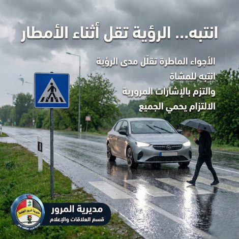 أصدرت مديرية المرور العامة، اليوم الجمعة، تحذيراً عاجلاً للأخوة سائقي المركبات في عموم محافظات البلاد، تزامناً مع دخول موجة من الأمطار والتقلبات الجوية التي تشهدها المنطقة، داعيةً الجميع إلى توخي أعلى درجات الحيطة والحذر أثناء القيادة.