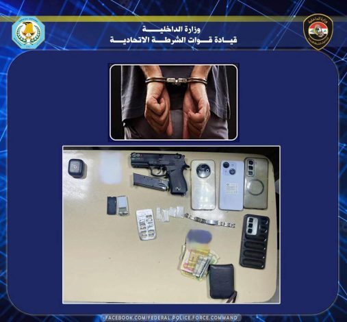 أعلنت قيادة الشرطة الاتحادية، اليوم، عن تنفيذ سلسلة عمليات أمنية ناجحة في مناطق متفرقة من العاصمة بغداد، أسفرت عن إلقاء القبض على 8 متهمين بقضايا جنائية ومخالفات قانونية متنوعة، وضبط أسلحة ومواد مخدرة.