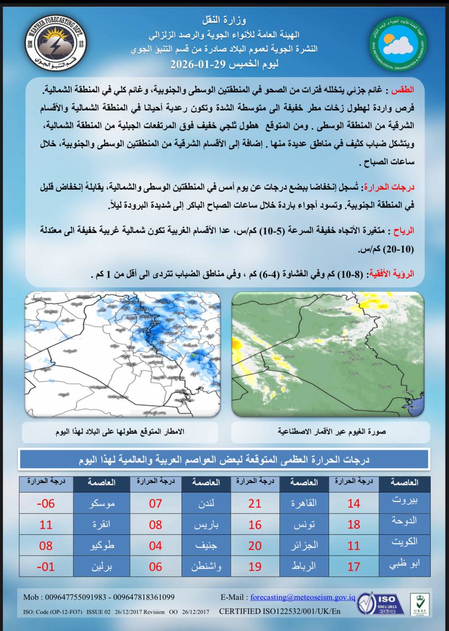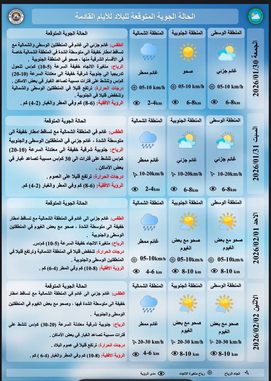 أعلنت، هيئة الأنواء الجوية، اليوم الخميس ، (29 كانون الثاني 2026) ، عن تفاصيل الحالة الجوية في البلاد للأيام المقبلة، مشيرة إلى تأثر المنطقة بمنخفض جوي يتسبب بتساقط أمطار رعدية وتشكل للضباب، مع رصد نشاط للرياح المسببة لتصاعد الغبار.