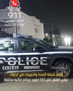 أعلنت قيادة شرطة محافظة كركوك، اليوم، عن تمكن مفارزها التابعة لـ قسم شرطة النجدة والدوريات من إلقاء القبض على (14) متهماً بجرائم جنائية متنوعة في مناطق متفرقة من المحافظة.