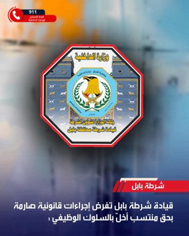 وذكر بيان لإعلام قيادة شرطة محافظة بابل ، تلقته وكالة أرض آشور الإخبارية، ( 30 كانون الثاني 2026), انه”استناداً إلى أحكام قانون قوى الأمن الداخلي والأنظمة والتعليمات النافذة ، وبالنظر لما صدر من أحد منتسبي عقود الشرطة حديثي الانضمام إلى سلك الشرطة من تصرف مخالف للضوابط ، تمثل بقيامه بإجراء بث مباشر عبر مواقع التواصل الاجتماعي وهو يرتدي الزي العسكري الرسمي ، ومخاطبته الجمهور بما لا ينسجم مع الواجبات الوظيفية والانضباط العسكري، الأمر الذي يُعد مخالفة جسيمة وإساءة صريحة إلى هيبة المؤسسة الأمنية وسمعتها، تقرر ما يأتي :