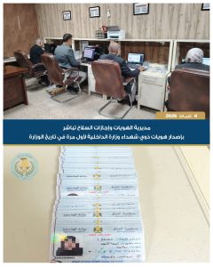 مديرية الهويات وإجازات السلاح تباشر بإصدار هويات ذوي شهداء وزارة الداخلية لأول مرة في تاريخ الوزارة