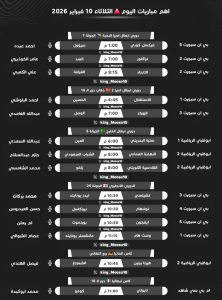 تشهد الملاعب العالمية اليوم الثلاثاء 10 فبراير 2026 حزمة من المواجهات النارية التي تجمع بين الإثارة القارية في آسيا، والمنافسة الشرسة في الدوري الإنجليزي، بجانب لقاءات الحسم في كؤوس ألمانيا وإيطاليا.