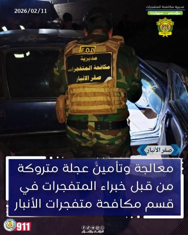 أعلنت مديرية مكافحة المتفجرات، اليوم الأربعاء (11 شباط 2026) ، عن تمكن كوادرها المتخصصة في محافظة الأنبار من السيطرة على تهديد محتمل ومعالجة عجلة متروكة، وذلك ضمن جهودها المستمرة لتعزيز الاستقرار والأمن في القاطع.