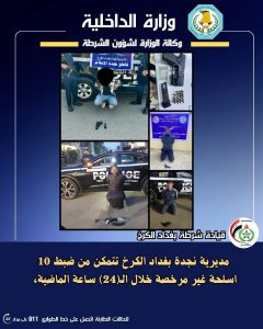 ذكر بيان لإعلام القيادة تلقته وكالة أرض آشور الإخبارية، أن “مفارز مديرية نجدة بغداد الكرخ تمكنت من ضبط 10 أسلحة غير مرخصة خلال الـ(24) ساعة الماضية”.