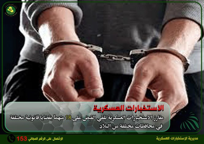 مديرية الاستخبارات العسكرية تطيح بـ 18 مطلوباً للقضاء في أربع محافظات