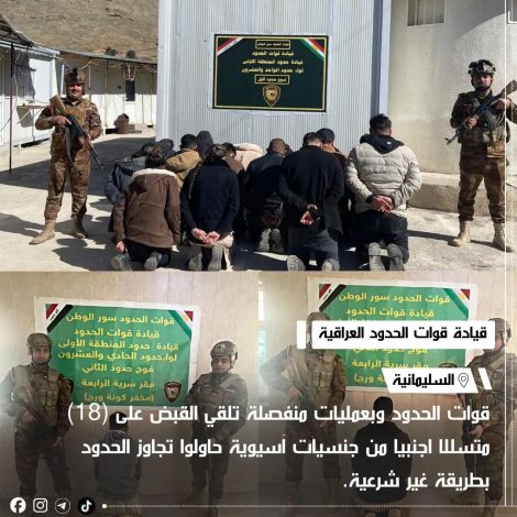 وذكر بيان لإعلام القيادة تلقته وكالة “أرض آشور” الإخبارية، أن “مفارز لواء الحدود الثالث ولواء الحدود الحادي والعشرين، وضمن عمليات منفصلة، نجحت في إلقاء القبض على (18) متسللاً من جنسيات آسيوية”.