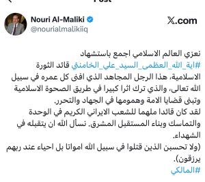 الرئيسية/الأخبار السياسية/المالكي يعزي باستشهاد السيد الخامنئي: تبنى قضايا الأمة وهمومها في الجهاد والتحرر الأخبار السياسيةالاخبار العاجلة المالكي يعزي باستشهاد السيد الخامنئي: تبنى قضايا الأمة وهمومها في الجهاد والتحرر Publishing Directorمارس 2, 2026 أقل من دقيقة شارك هذا الموضوع: Share on Facebook (Opens in new window) Facebook Share on X (Opens in new window) X Publishing Directorمارس 2, 2026 أقل من دقيقة فيسبوك X سكايب ماسنجر ماسنجر واتساب تيلقرام ڤايبر مشاركة عبر البريد