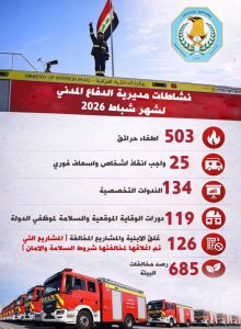 أعلنت مديرية الدفاع المدني العامة، التابعة لوزارة الداخلية، عن الحصيلة الإحصائية لنشاطاتها ومهامها الإنسانية والرقابية المنفذة في عموم البلاد خلال شهر شباط لعام 2026. وأظهرت البيانات الرسمية التي تلقتها “وكالة أرض آشور الإخبارية” من إعلام المديرية، جهوداً حثيثة في مجالات مكافحة الحرائق، والإنقاذ، والتوعية، فضلاً عن إجراءات السلامة الوقائية.