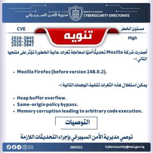 أصدرت مديرية الأمن السيبراني في وزارة الداخلية، اليوم الأحد، تحذيراً أمنياً عاجلاً يتعلق بوجود ثغرات تقنية عالية الخطورة في متصفح “Mozilla Firefox”، داعية المستخدمين إلى اتخاذ إجراءات احترازية فورية.
