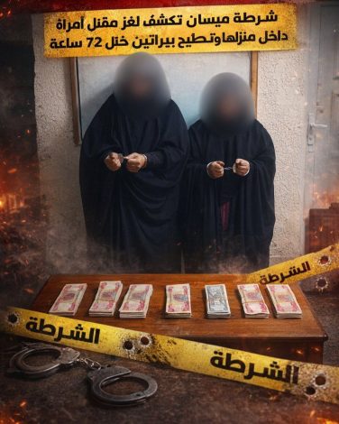 أعلنت” قيادة شرطة ميسان : ان مفارز مكافحة إجرام المحافظة، تمكنت بالاشتراك مع خلية الصقور الاستخبارية ، من كشف ملابسات جريمة قتل غامضة والإطاحة بامرأتين متهمتين بقتل امرأة وحرق جثتها بدافع السرقة ، وذلك في منطقة الماجدية ضمن مركز مدينة العمارة .