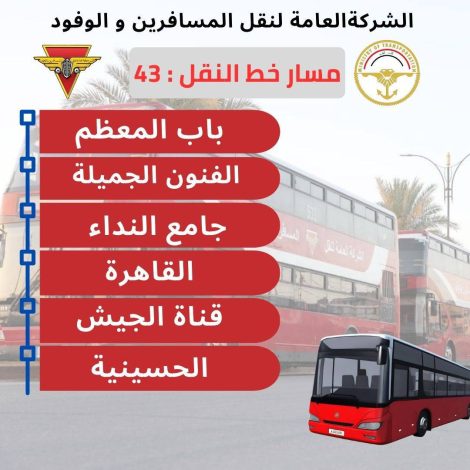 اعلنت الشركة العامة لنقل المسافرين والوفود،اليوم الاثنين ، افتتاح خط النقل الجماعي رقم (٤٣) ضمن خططها المستمرة لتوسيع شبكة النقل العام في العاصمة بغداد وتسهيل حركة المواطنين بين المناطق الحيوية.