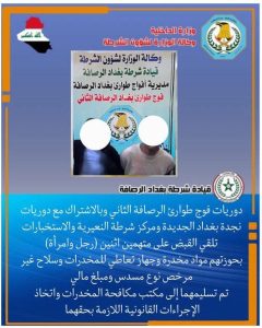 وذكر البيان الذي تلقته “وكالة أرض آشور الإخبارية”، أن دوريات فوج طوارئ الرصافة الثاني، وبالاشتراك مع دوريات نجدة بغداد الجديدة ومركز شرطة النعيرية والاستخبارات، نفذت عملية أمنية أسفرت عن إلقاء القبض على متهمين اثنين (رجل وامرأة).