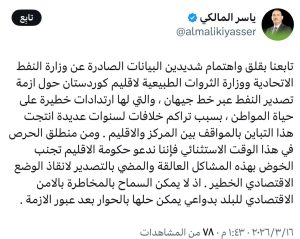 طالب، رئيس كتلة دولة القانون النيابية ياسر المالكي، اليوم الإثنين، حكومة أربيل بفك حصار جيهان لتجنب الانهيار المالي.
