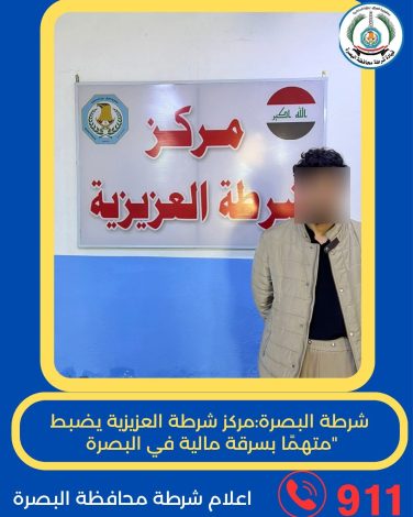 شرطة البصرة: مركز شرطة العزيزية يضبط متهمًا بسرقة مالية في المحافظة “