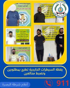 أعلنت قيادة شرطة محافظة البصرة، اليوم، عن تمكن مفارزها في السيطرات الخارجية من إلقاء القبض على عدد من المطلوبين للقضاء وضبط عجلات مخالفة، وذلك ضمن حصيلة واجباتها الأمنية الهادفة لتعزيز الاستقرار في المحافظة.
