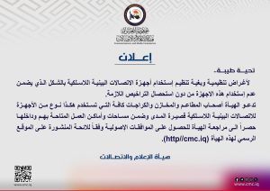 أصدرت هيأة الإعلام والاتصالات، اليوم الخميس، إعلاناً تنظيمياً موجهاً إلى أصحاب المصالح التجارية والخدمية بشأن استخدام أجهزة الاتصالات اللاسلكية البينية، تلقت وكالة “أرض آشور” نسخة منه.