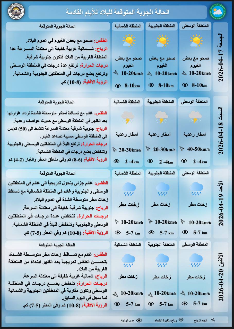 وأضاف البيان أن التوقعات الفنية تشير إلى هطول أمطار تتراوح شدتها بين المتوسطة والغزيرة، تكون مصحوبة بظاهرتي البرق والرعد، مع تسجيل نشاط ملحوظ في الرياح الجنوبية الشرقية، وهو ما قد يؤدي إلى تصاعد الغبار وتدني مدى الرؤية الأفقية في بعض المناطق المتأثرة.